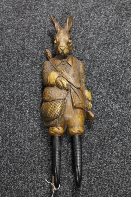 A carved wooden wall bracket in the form of a rabbit