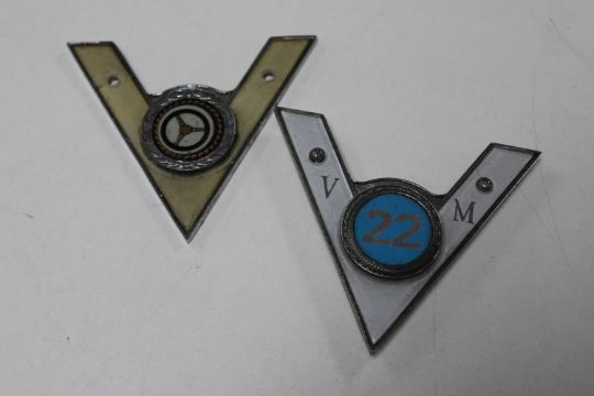 Two vintage car badges