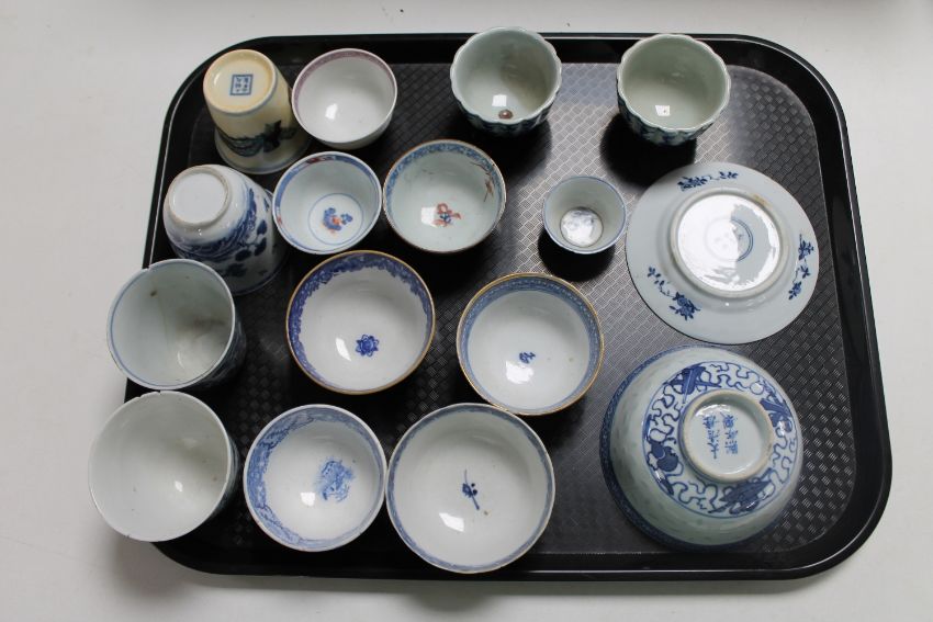 A tray of sixteen pieces of antique and later Chinese export porcelain tea bowls, rice bowls, plate with character marks to base