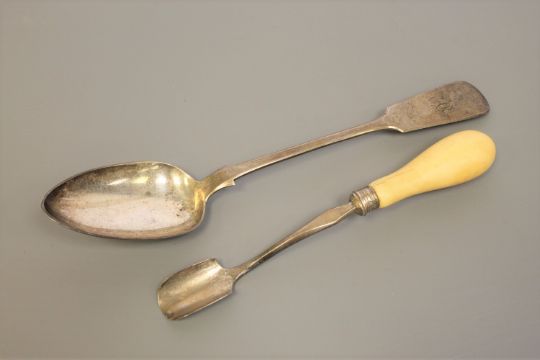 A large Newcastle silver basting spoon together with an ivory handled Newcastle silver butter or cheese scoop