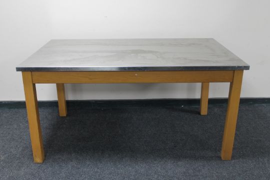 A stainless steel topped dining table