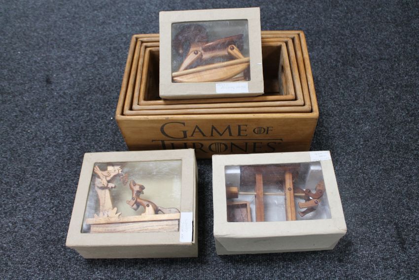 A set of four graduated wooden Game of Thrones caddies together with three boxed wooden hand made toys