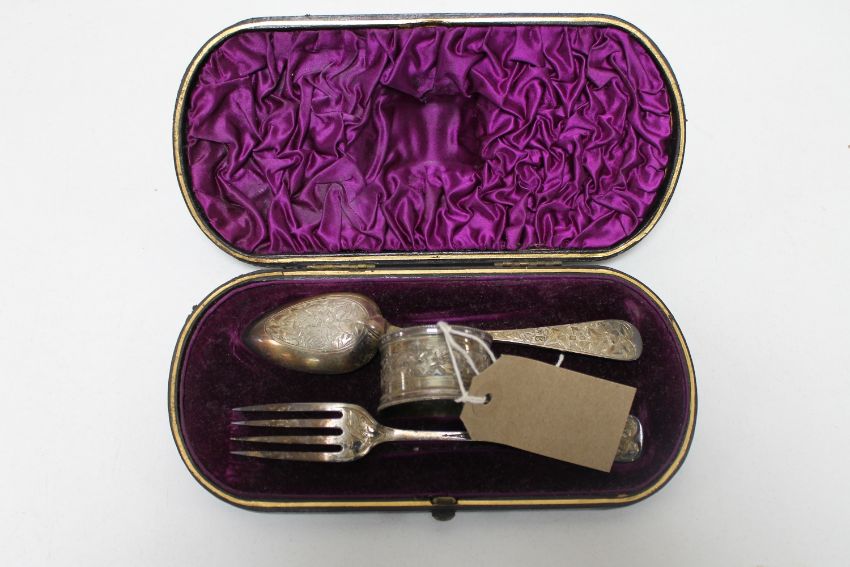 A cased silver fork and spoon with napkin ring, Birmingham 1882