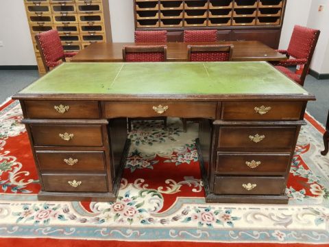 An oak twin pedestal desk with green tooled leather top, width 168cm