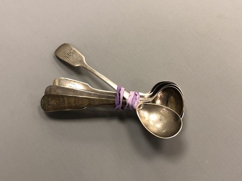 Seven Newcastle silver salt and mustard spoons (six Georgian one Victorian)