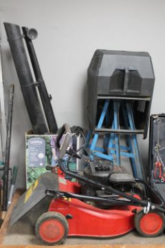 A Champion 3.5hp petrol lawn mower with grass box together with a boxed garden vacuum and a pair of car ramps