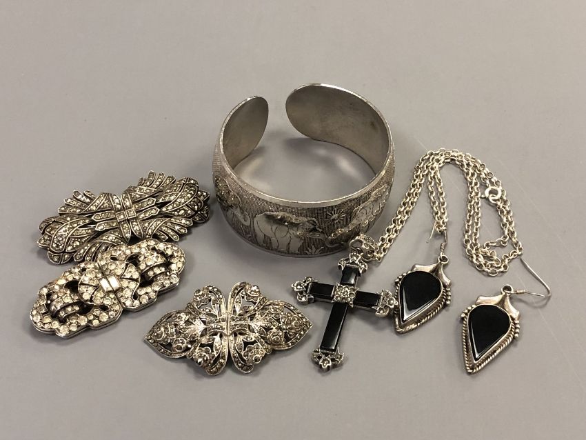A collection of silver and white metal jewellery to include Sterling silver clip brooch, elephant bangle stamped 925, black onyx crucifix etc.
