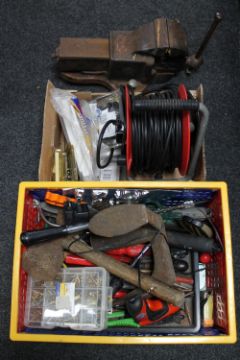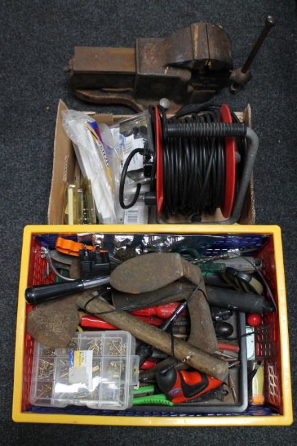 A crate of assorted hand tools and hardware together with a further box containing switches, extension lead, together with a heavy duty metal bench vice