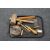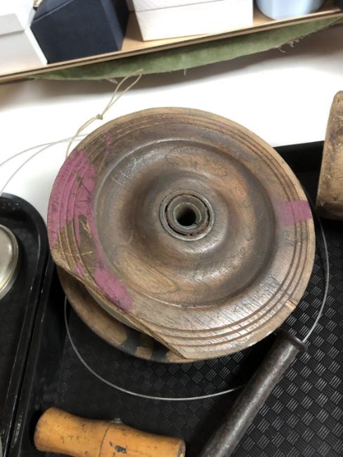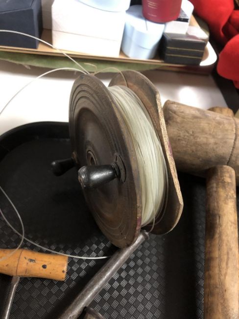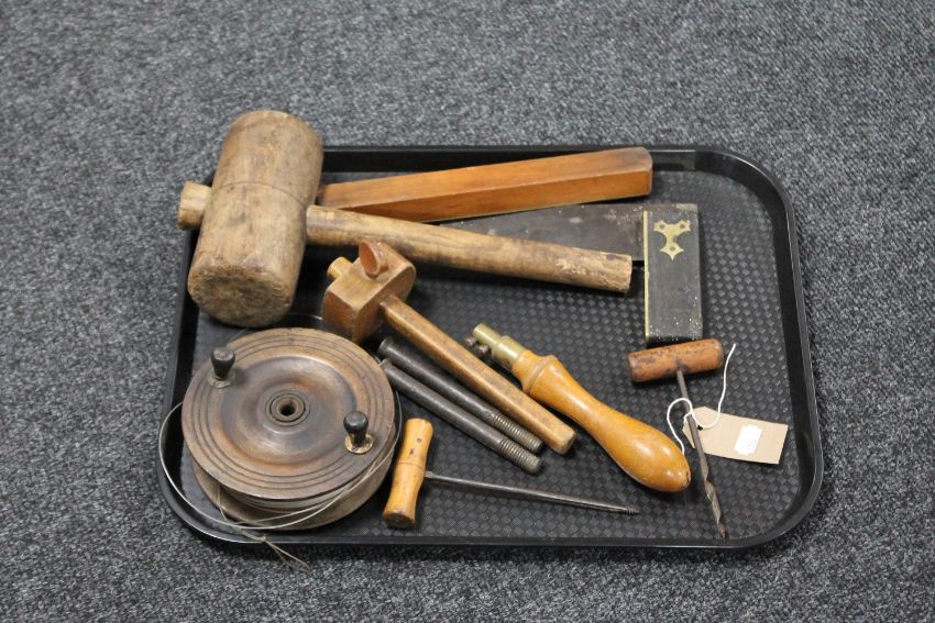 A tray containing antique fishing reel, vintage woodworking tools and an antique corkscrew
