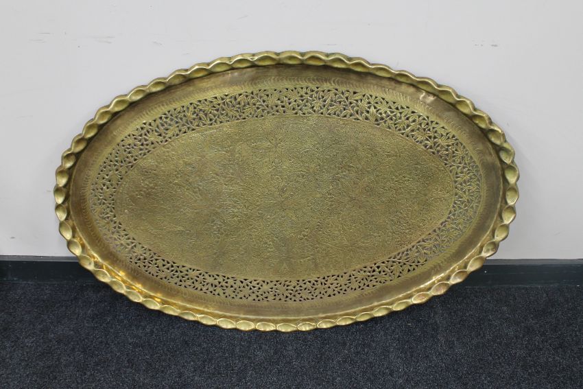 A large oval Indo-Persian brass pie crust edge tray