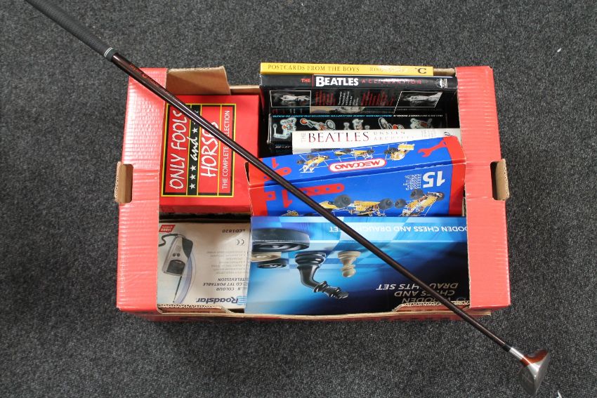A box containing assorted books, The Beatles etc, Only Fools and Horses box set, Meccano set, chess set etc