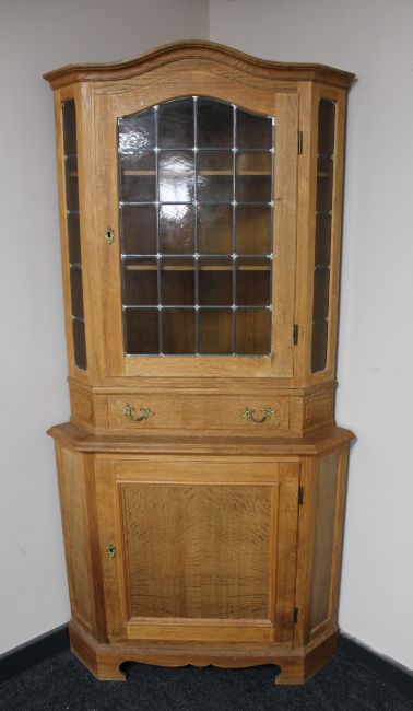 A blond oak leaded glass door corner display cabinet