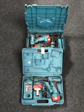 A cased Makita 14 volt twin drill set with battery and charger, cased Makita 12 volt with batteries and charger
