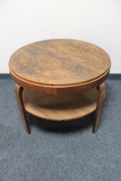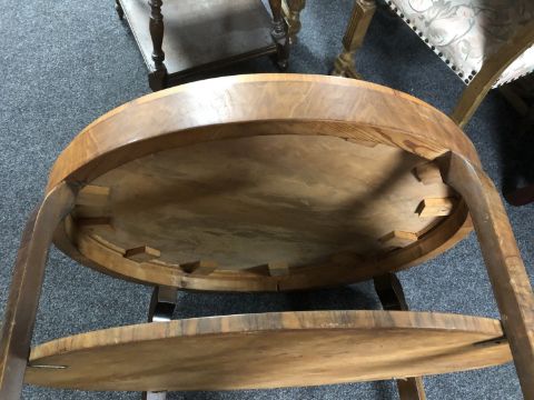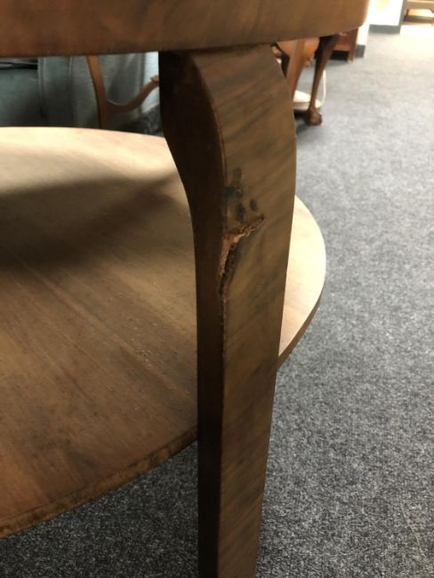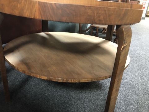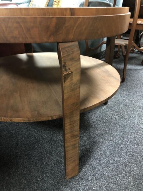 79cm diameter, 57cm high. Veneer lifting in one area on one of the legs. Otherwise in good condition.