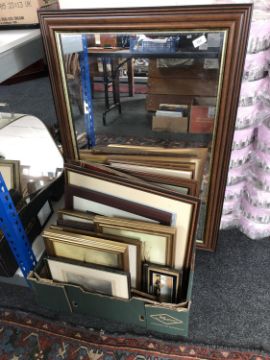 A mahogany framed mirror together with a box of framed pictures and prints, oils on canvas, signed print etc.