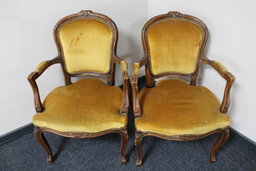 A pair of carved continental salon armchairs upholstered in a gold fabric