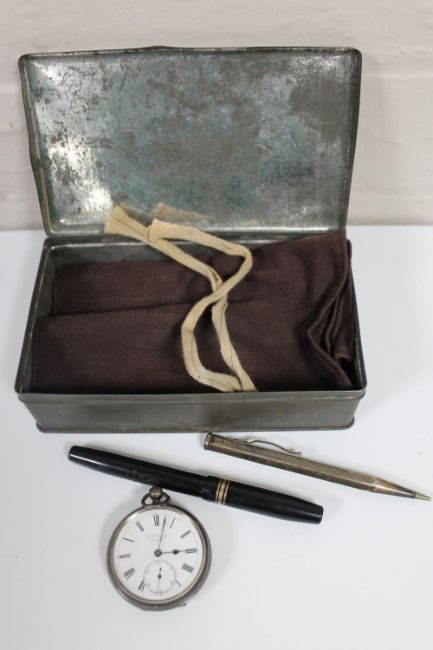 A metal tin containing cloth cutlery bag, silver mechanical pencil, fountain pen, silver cased pocket watch by J. W. Benson, London 1888