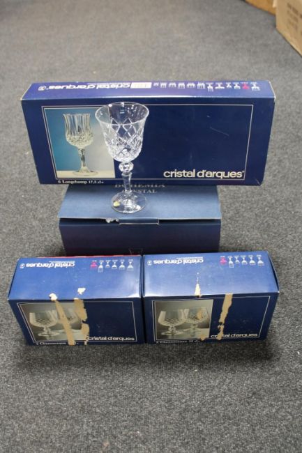 A boxed set of six Bohemian crystal wine glasses together with a further set of boxed Cristal D'Arques Longchamp wine glasses and two boxes containing two Cristal D'Arques brandy glasses
