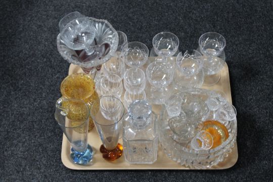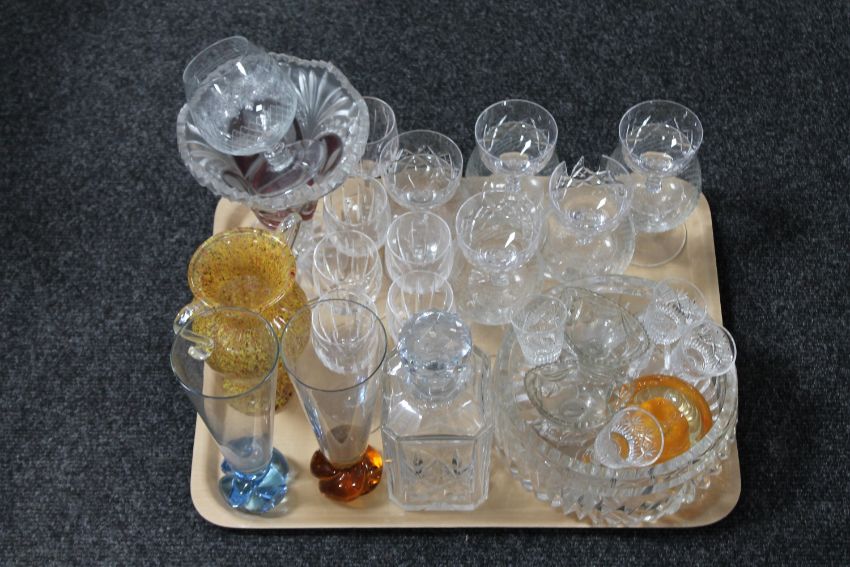 A tray of assorted glass ware including decanter, glass bowls, assorted drinking glasses etc