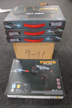 Four Regimental Police mini uzi water pellet guns with box containing approximately 40,000 water pellets