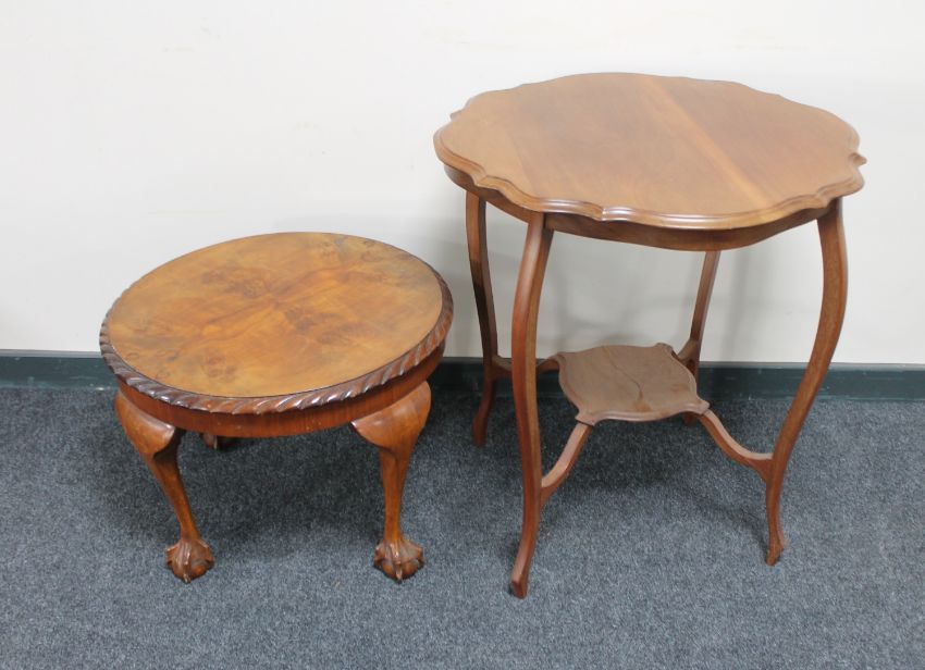 An Edwardian mahogany shaped two tier occasional table together with a circular walnut coffee table on claw and ball feet