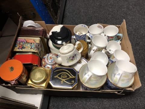 A box of a quantity of Ringtons tins, vases, teapots, mugs etc