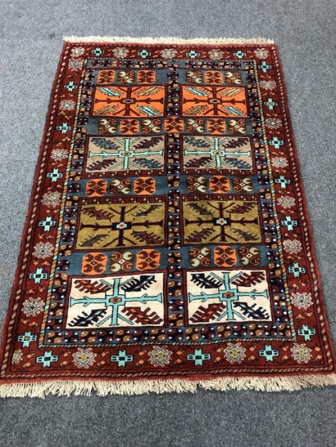 A Caucasian fringed rug on red ground, 131 cm x 180 cm