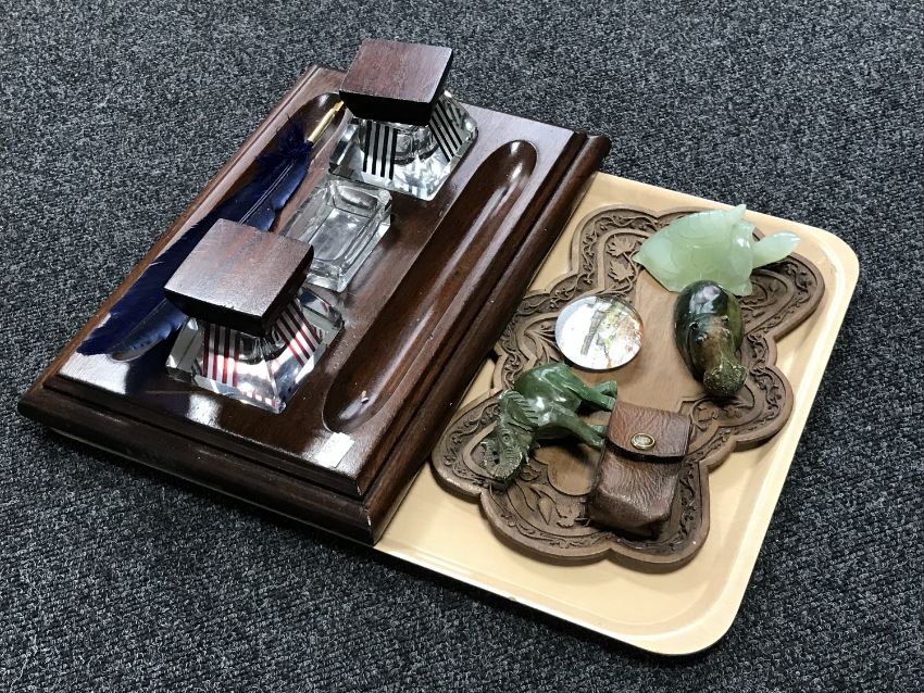 A tray of desk stand with glass insets and feather quill, carved Eastern tray, Margate tourist's paperweight, polished stone animals etc