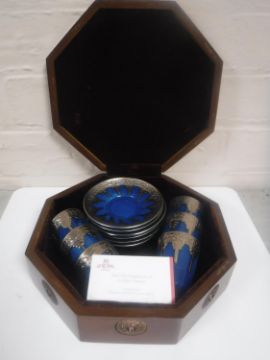 A suite of continental silvered glass beakers on saucers contained within a copper topped casket.