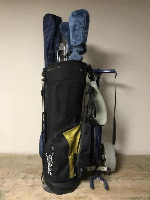 A golf bag containing part set of irons, three drivers, folding golf trolley, together with a Calloway golf travel bag