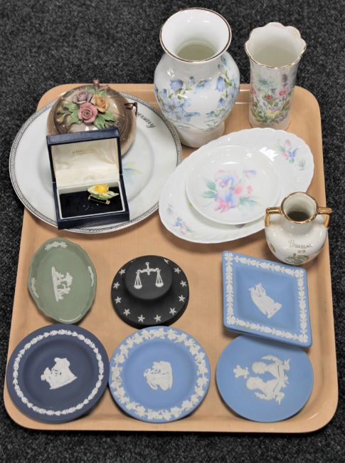 A tray of assorted china : Wedgwood Jasperware including the Wedgwood Society Collector's scales of justice paperweight, Aynsley dishes, Coalport ceramic brooch, Capodimonte trinket dish