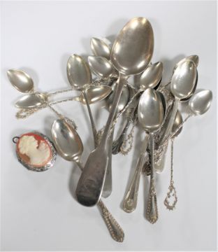 A silver serving spoon, London hallmarks, dated 1846 and a quantity of white metal spoons and a cameo brooch containing a bone elephant