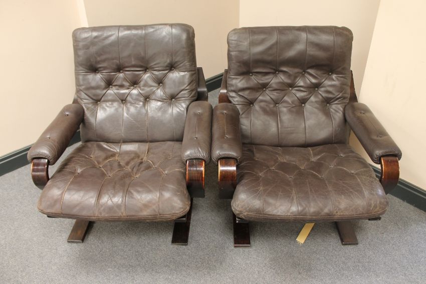 A pair of late 20th century wood framed brown buttoned leather armchairs