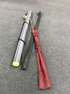 A Wilmex sea tackle rod tube containing two sea rods in bag, Abu Garcia beach caster and a Ron Thompson Superior caster