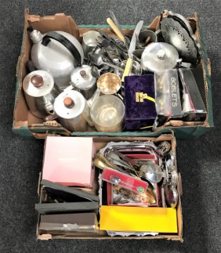 Two boxes of metal ware - stainless steel tea services, aluminium kettle, box and unboxed cutlery, goblets etc