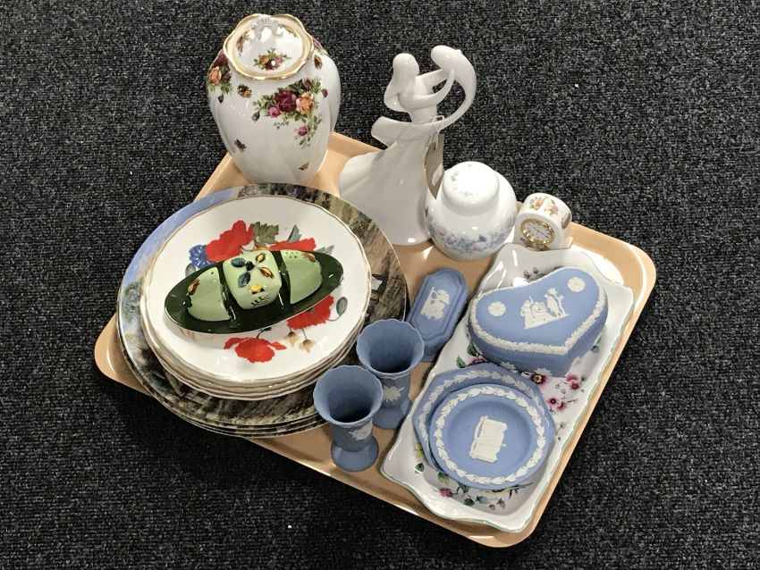 A tray of assorted china - collector's plates, Carlton Ware cruet set, six pieces of Wedgwood Jasperware, Aynsley miniature clock etc