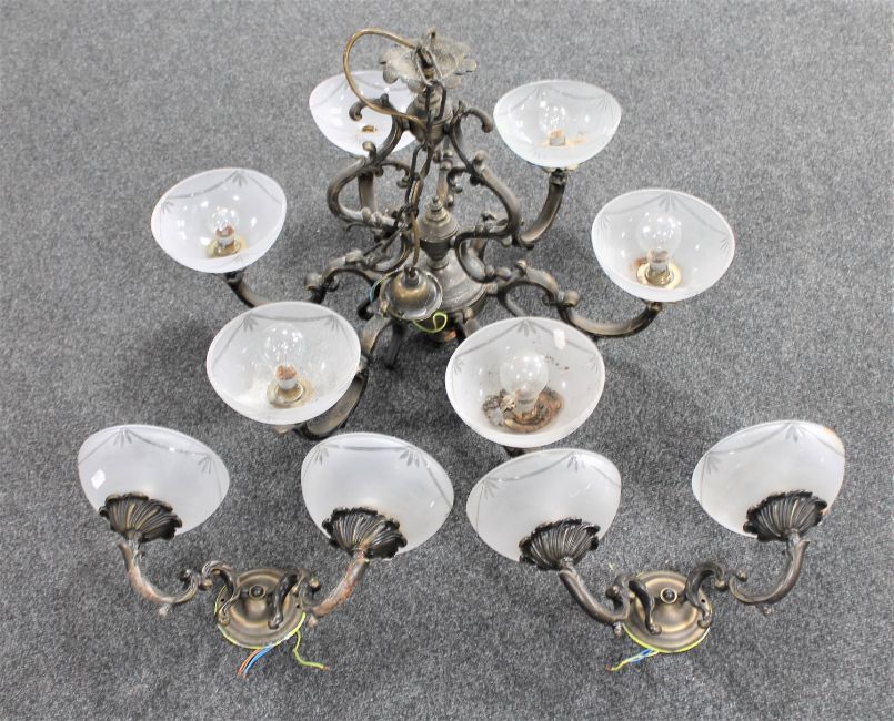 An ornate metal six way light fitting with glass shades together with a pair of double wall lights