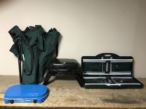 A folding portable picnic table bench set together with folding chairs and two gas stoves