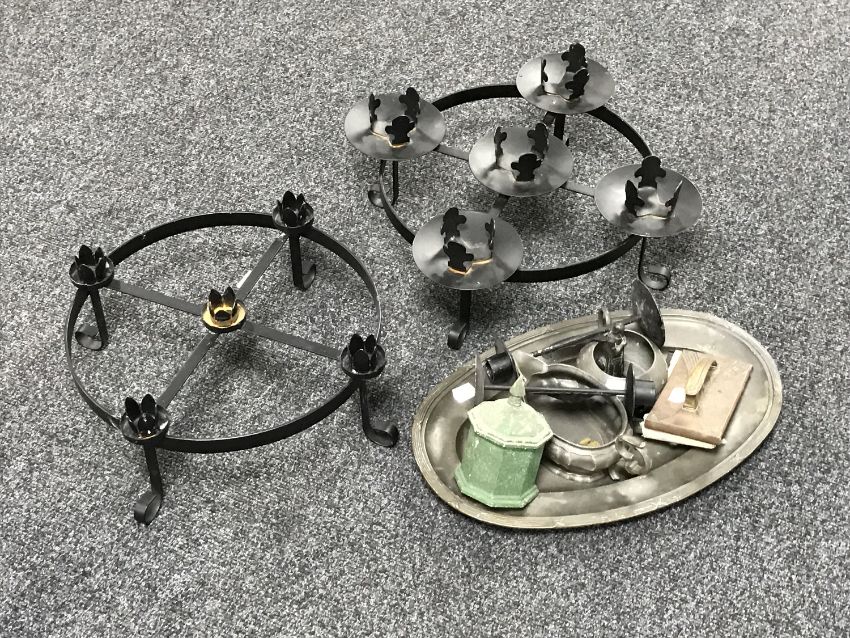 Two metal five-candle candle holders and an antique oval plated tray containing Art Nouveau desk blotter, plated milk jug, pewter sugar basin etc