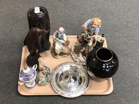 A tray of carved figures, Capodimonte figure of a cobbler, Leonardo Collection vase etc