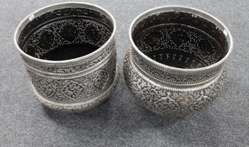 A pair of Indian style metal table lamps together with two metal planters and an ice bucket