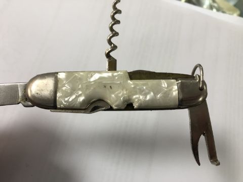 A tray containing vintage cut throat razors, set of 19th century field glasses in case, vintage fountain pen, lenses, pocket knife etc