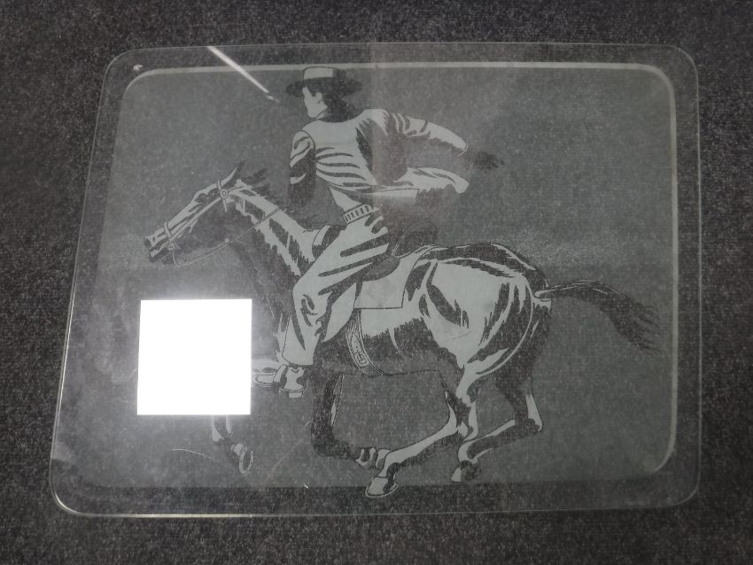 Three glass panels depicting a bull, map of south America, Goucho on horse back