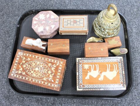 A tray of Eastern trinket boxes, brass bell, ivory figure of a sphinx on wooden base