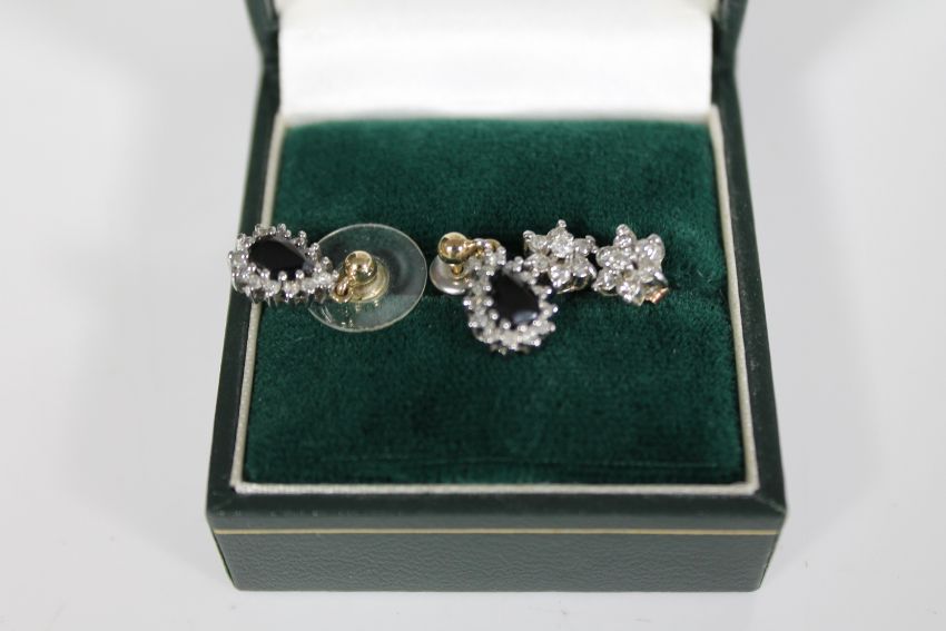 A pair of 9ct gold and diamond and sapphire earrings in a box, together with a pair of 9ct gold earrings
