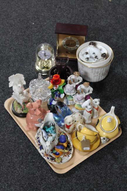 A tray of Murano glass clown, continental figures, mantel clocks, crystal trinket dish, money boxes