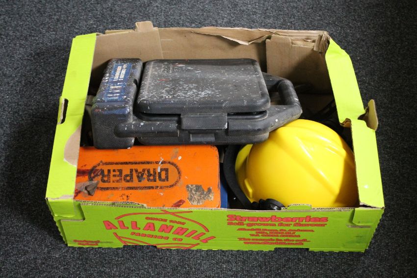 A box containing hard hat, hand tools etc