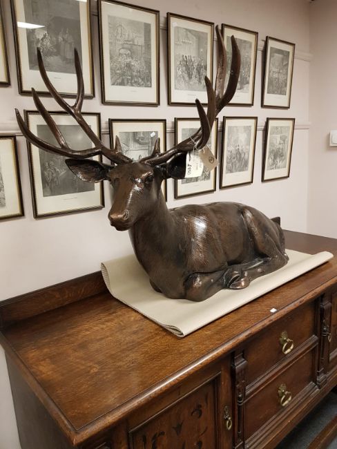 A cast patinated aluminium figure - stag lying down, height 87 cm