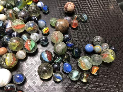 A box of miscellaneous - glass storage jar of marbles, part trinket set, wooden fish ornament etc