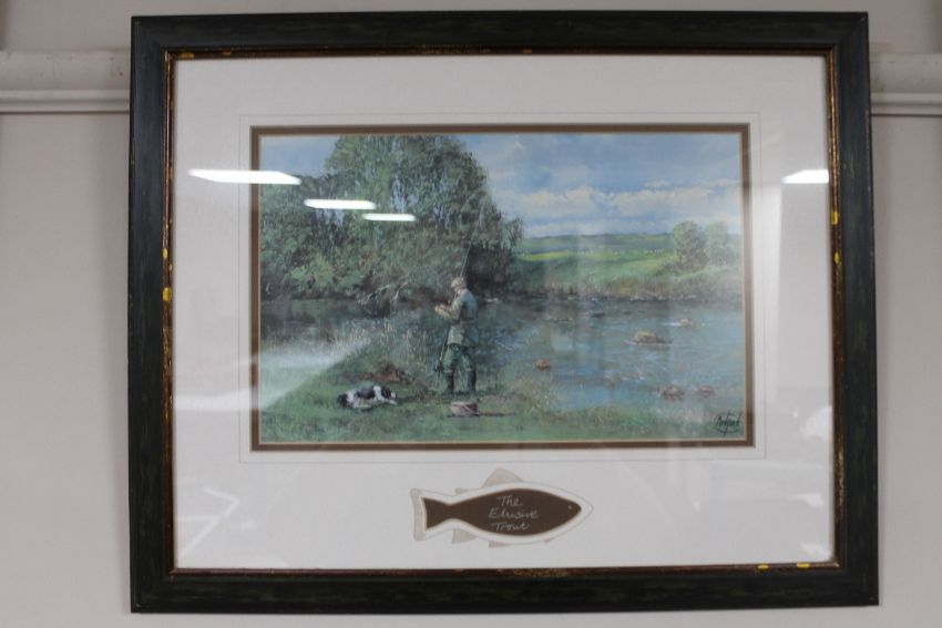 A colour print after Madgwick, The Elusive Trout, together with two other silvered framed prints